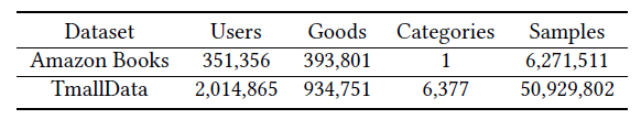 Tmall Data数据集:它是从 Mobile Tmall App 中随机采样的 200 万天猫用户,并获得这些用户在10 天内的历史行为。我们保留至少600 个用户点击的 item。