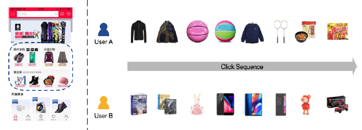天猫是中国最大的 Business-To-Customer: B2C 电商平台,它在线提供十亿规模的商品,服务于十亿规模的用户。2018 年 11 月 11 日,著名的天猫全球购物节,商品交易总额(Gross Merchandise Volume: GMV)大约为 2130 亿元,较 2017 年同期增长 26.9% 。随着用户和商品的不断增长,帮助每个用户找到他 / 她可能感兴趣的商品变得越来越重要。近年来,天猫在开发个性化推荐系统方面付出了巨大的努力,极大地促进了用户体验的优化以及商业价值的提升。例如,占天猫总流量一半左右的移动天猫 App 首页(如下图左图所示),就部署了推荐系统来展示个性化商品,从而满足客户的个性化需求。