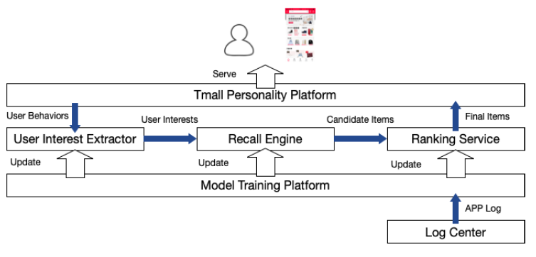 为了在天猫部署 MIND 从而服务于十亿级用户,论文构建了一个系统来实现数据集采集、模型训练、以及在线 serving 的整个 pipeline。部署的系统显著提高了移动天猫 App 首页的点击率( click-through rate: CTR)。目前MIND 已经在 Mobile Tmall App 首页上部署从而处理主要的在线流量。