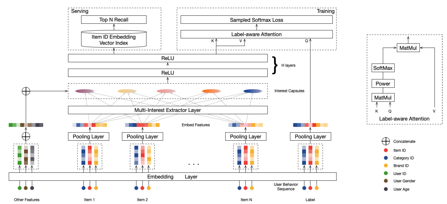 Multi-Interest Extractor Layer:用户行为 embedding 被馈入多兴趣提取器层从而产生兴趣胶囊。通过将兴趣胶囊和用户画像 embedding 拼接,然后经过几个 ReLU 的全连接层进行转换,可以得到用户 representation 向量。