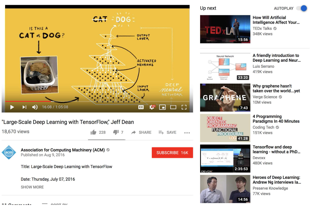 YouTube 的一个关键产品提供了在给定观看视频的情况下推荐下一个观看视频的功能(what video to watch next ),如下图所示。它的用户界面为用户提供了多种与推荐视频交互的方式,如点击、观看、喜欢、拒绝(dismissal)。