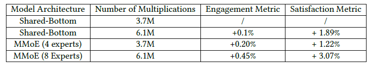 YouTube 上的在线实验结果如下表所示,其中 MMoE 模型使用 4 个专家或 8 个专家。