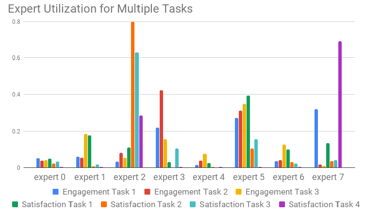 可以看到:一些互动任务(engagement task)和其它互动任务共享多位专家,而满意度任务(satisfaction task)倾向于共享一小部分高效用(high utilization)的专家 ,这是通过使用这些专家的累计概率来衡量的。