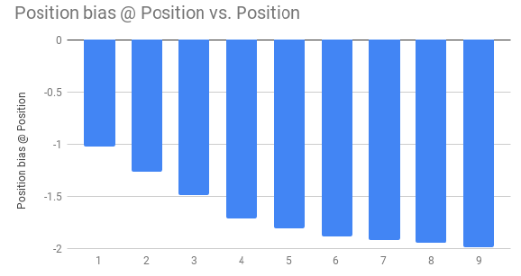 下图显示了每个位置学到的位置偏差。可以看到:对于较低的位置,学到的偏差较小。