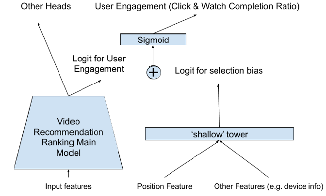 为了从有偏差的训练数据中建模并减少选择偏差(如位置偏差position bias),我们提出在主模型中添加一个shallow tower,如上图左侧所示。shallow tower 接受与选择偏差相关的输入,例如当前系统决定的排序顺序(ranking order),并输出标量作为主模型的最终预测的偏差项(bias term)。