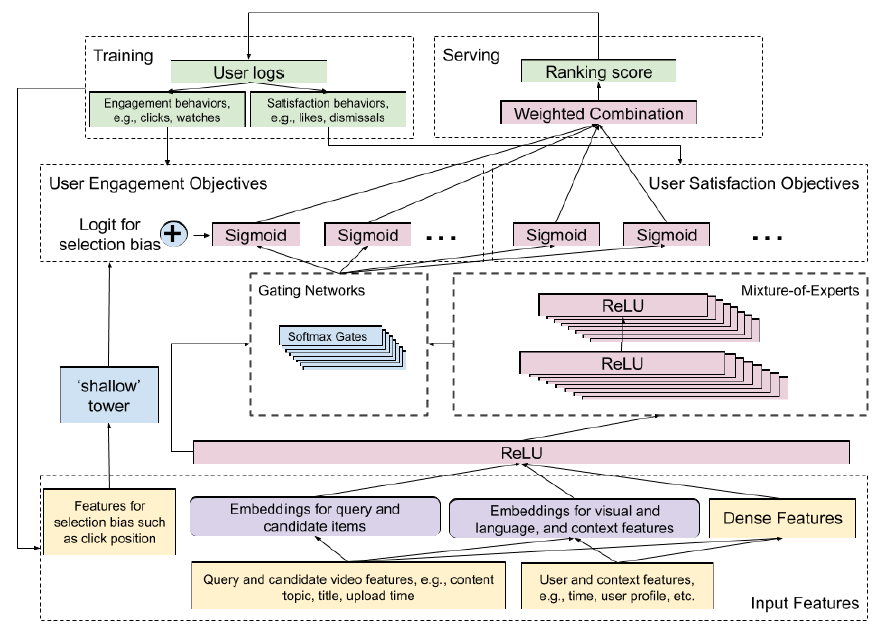 排序框架使用用户日志作为训练数据,并构建 Mixture-of-Experts layer 来预估两类用户行为:互动( engagement)(如点赞、评论、分享、@ 好友等)、满意度(satisfaction)。它用侧塔(side-tower)修正了排序的选择偏差(selection bias)。最重要的是,多个预测结果被组合成一个最终的排序分(ranking score)。