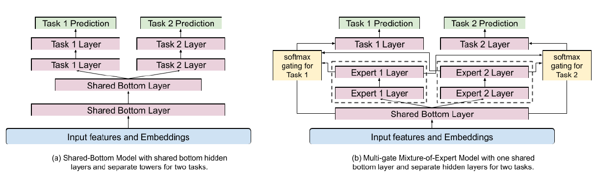 多目标排序系统通常使用共享底部(shared-bottom)的模型架构(如下图 (a) 所示)。然而,当任务之间的相关性较低时,这种硬参数共享(hard-parameter sharing)技术有时会损害多个目标的学习。为了缓解多目标的冲突(conflict),我们采用并扩展了最近发布的 Multi-gate Mixture-of-Experts: MMoE 模型架构。