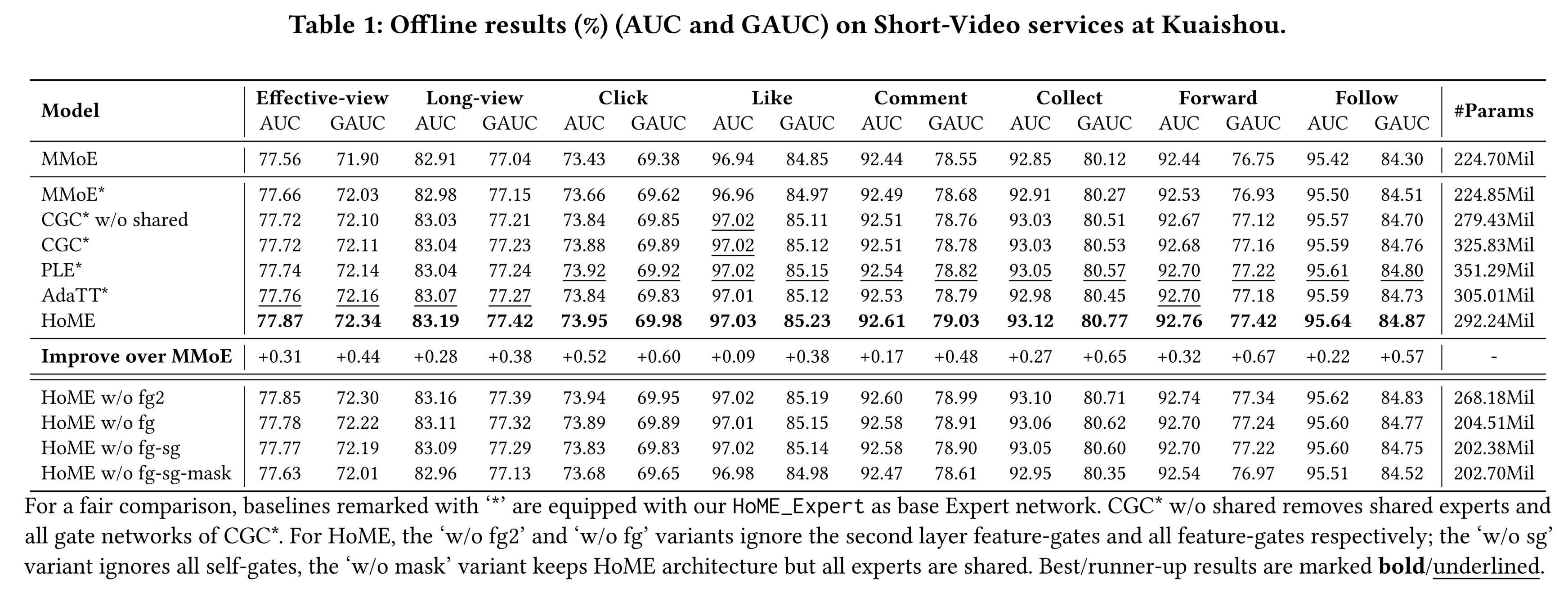 然后我们将 HoME 与同样配备 HoMEExpert 的 improved baselines 进行对比。例如 'CGC* w/o shared':CGC 的变体,忽略 shared experts 和所有 gate network 。