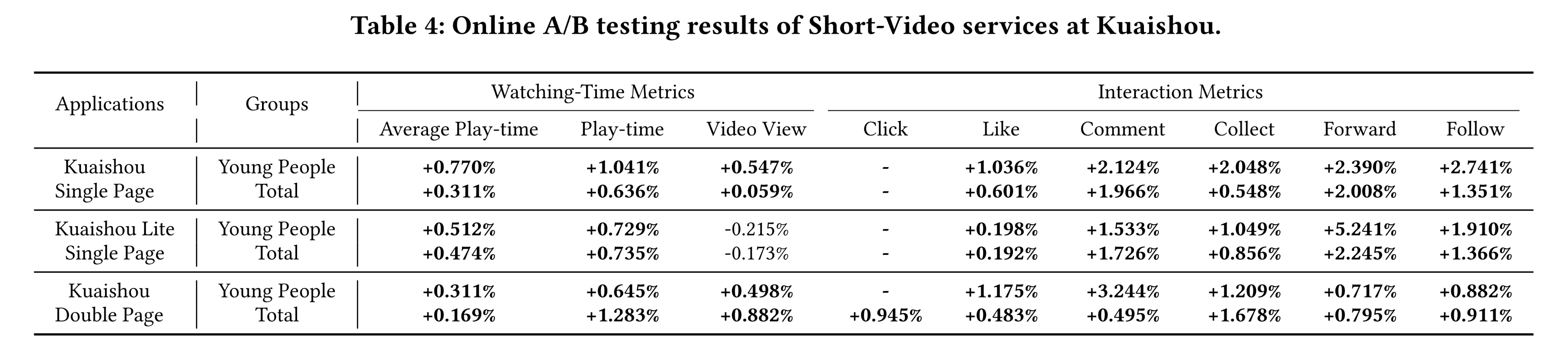 本节将 HoME 部署为 online ranking model,应用于三个短视频场景: Kuaishou Single/Double Page (如 Figure 1 所示)和 Kuaishou Lite Single Page。在我们的业务中,核心指标是观看时长相关指标(例如人均播放时长),反映用户在 Kuaishou 平台上的总停留时间。同时我们还展示了视频观看量指标,衡量用户观看的短视频总数。Young 用户组和 Total 用户组的 online A/B test 结果如 Table 4 所示。实际上,在 Kuaishou 平台上,播放时长提升约 0.1% 就属于具有统计显著性的改进。