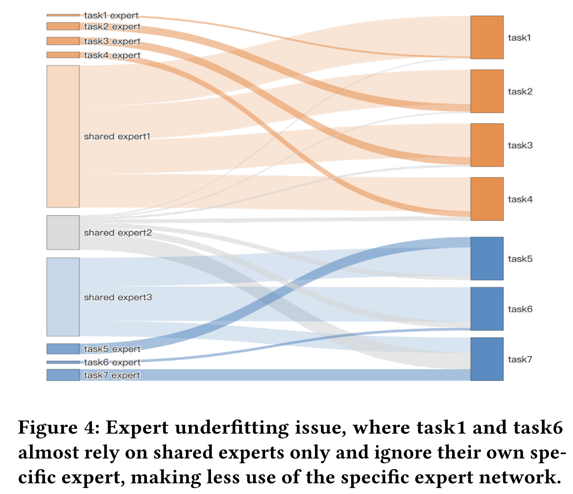 从 specific-expert learning 来看,存在 expert underfitting 问题,即某些 sparse tasks specific-experts 几乎无法提供任何信息。