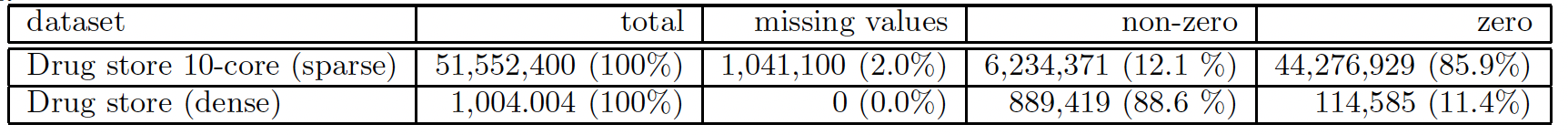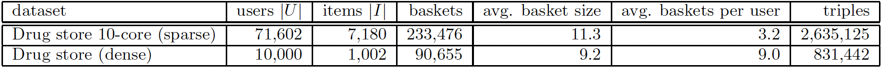 数据集:我们使用在线药店的匿名购买数据集。我们使用的数据集是一个 10 core 子集,其中每个用户总共至少购买了 10 个 item ,每个 item 至少被 10 个用户购买。我们还创建了它的一个子集,其中包含 10000 个最多购买的用户、以及 1000 个最多购买的 item ,从而评估稀疏性对方法的影响。
