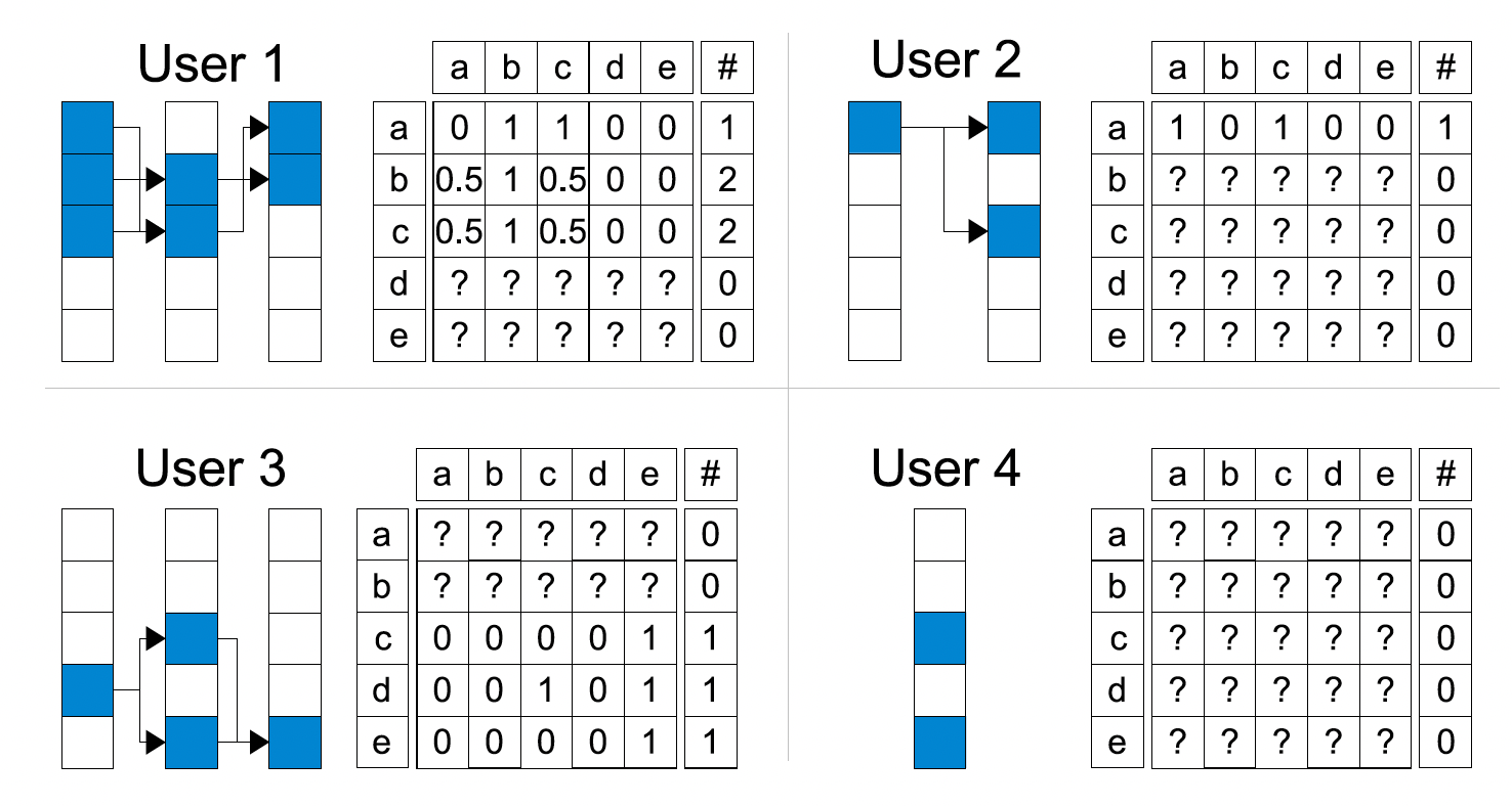 下图展示了个性化概率转移矩阵的一个例子。许多参数无法估计(图中以 ? 标记 ),因为没有对应的观察数据。此外,估计的转移概率仅基于少量观察数据,这意味着这些估计是不可靠的。乍一看,使用个性化马尔科夫链似乎是不合理的,接下来我们将讨论导致错误估计的原因是什么,并展示如何解决它。