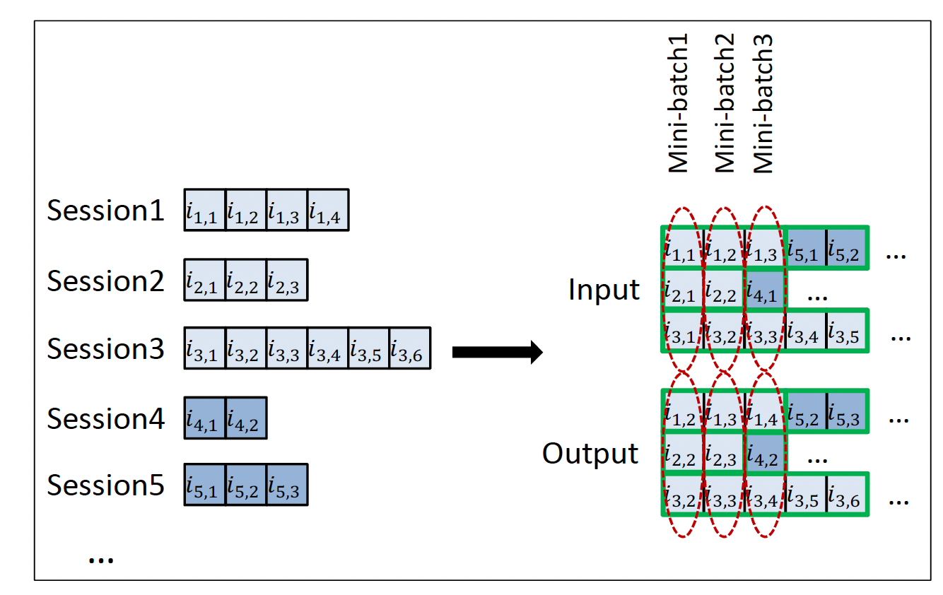 因此,我们使用 session-parallel mini-batch ,如下图所示。具体而言: