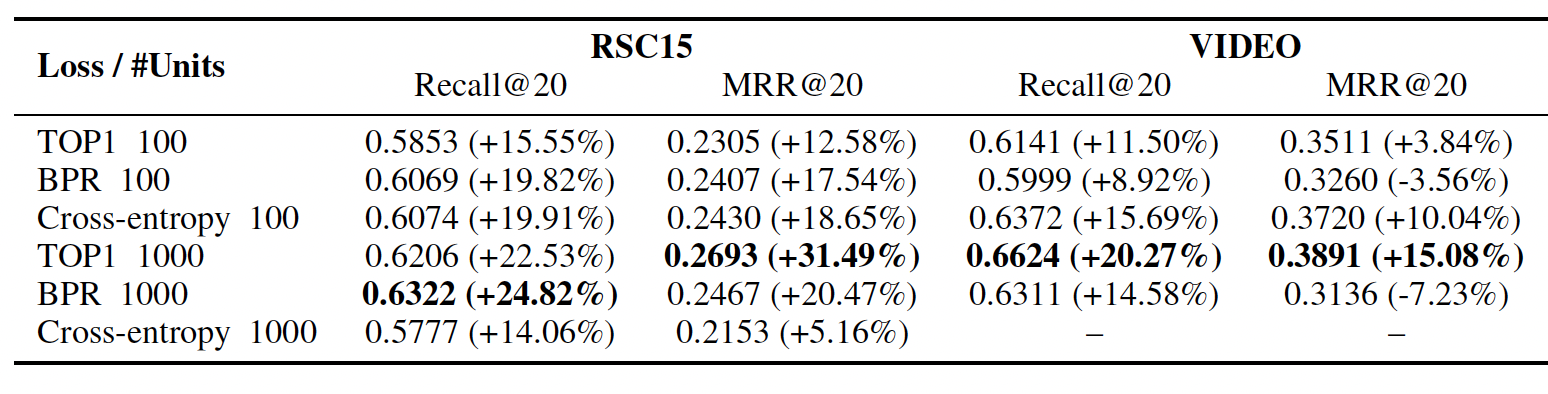 即使隐单元数量为 100,GRU-based 的方法在两个数据集上都显著优于 item-KNN。增加隐单元数量进一步改善 pair-wise loss 的结果,但是降低了交叉熵损失(即 point-wise loss )的准确率。