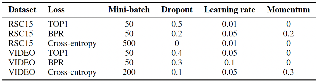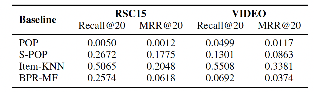 对于 RSC15数据集,我们对训练集中出现的 37483 个 item 进行排名。对于 VIDEO 数据集,因为 item 集合太大因此我们将 next item 和最流行的 30000 个 item 进行排名。这种评估的影响可以忽略不计,因为冷门的 item 通常 score 很低。此外,基于流行度的预过滤在实际推荐系统中很常见。