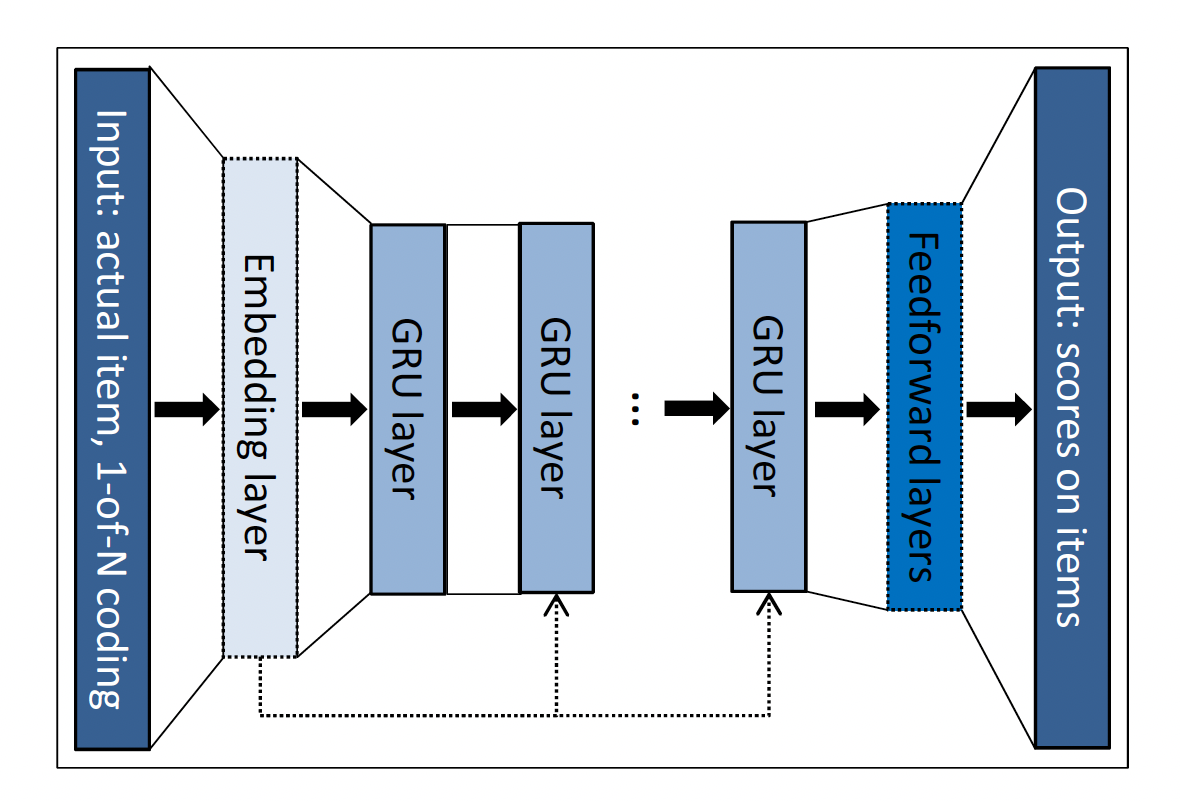 网络的核心是 GRU layer。可以使用多层 GRU layer,其中前一层的 hidden state 是下一层 的输入。最后一个 GRU layer 和输出层之间添加了额外的前馈层( Feedforward layer)(但是实验发现增加这个额外的前馈层对于效果提升没有帮助)。输出是每个 item 在当前会话中成为 next 的可能性。input 层也可以选择连接到网络中更深的 GRU layer,因为我们发现这可以提高性能。