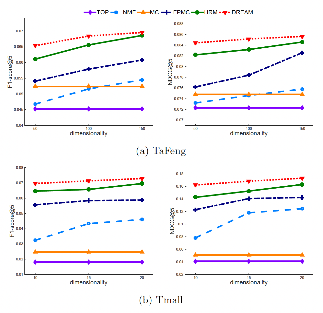 首先我们将 DREAM 模型与 baseline 方法比较,如下图所示。整体而言,next basket recommendation 的性能排名如下:DREAM, HRM, FPMC, NMF, MC, TOP 。
