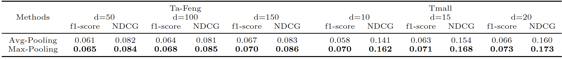 显然,均值池化是一种线性操作,这表明 basket 中的每个 item 都以独立的方式影响 basket representation 。然而在现实世界的场景中,我们购买的许多 item 都是交互的,即,一个 item 会影响我们是否购买另一个 item,而购买 item 的整体可以 shape 我们的兴趣。 因此,更好的解决方案是通过非线性运算来学习 basket 内 item 的复杂交互关系。最大池化是一种非线性操作,能够比线性操作更好地学习复杂的交互。