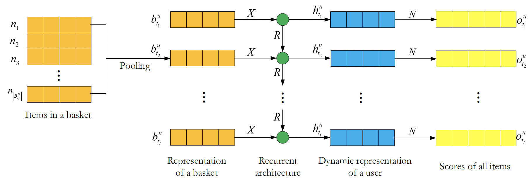 模型的输入是 basket 的序列。对于用户 basket basket 内 item 的潜在 representation basket item 的潜在 representation ,basket item 数量。现在,我们可以通过聚合这些 item representation 来生成basket basket representation