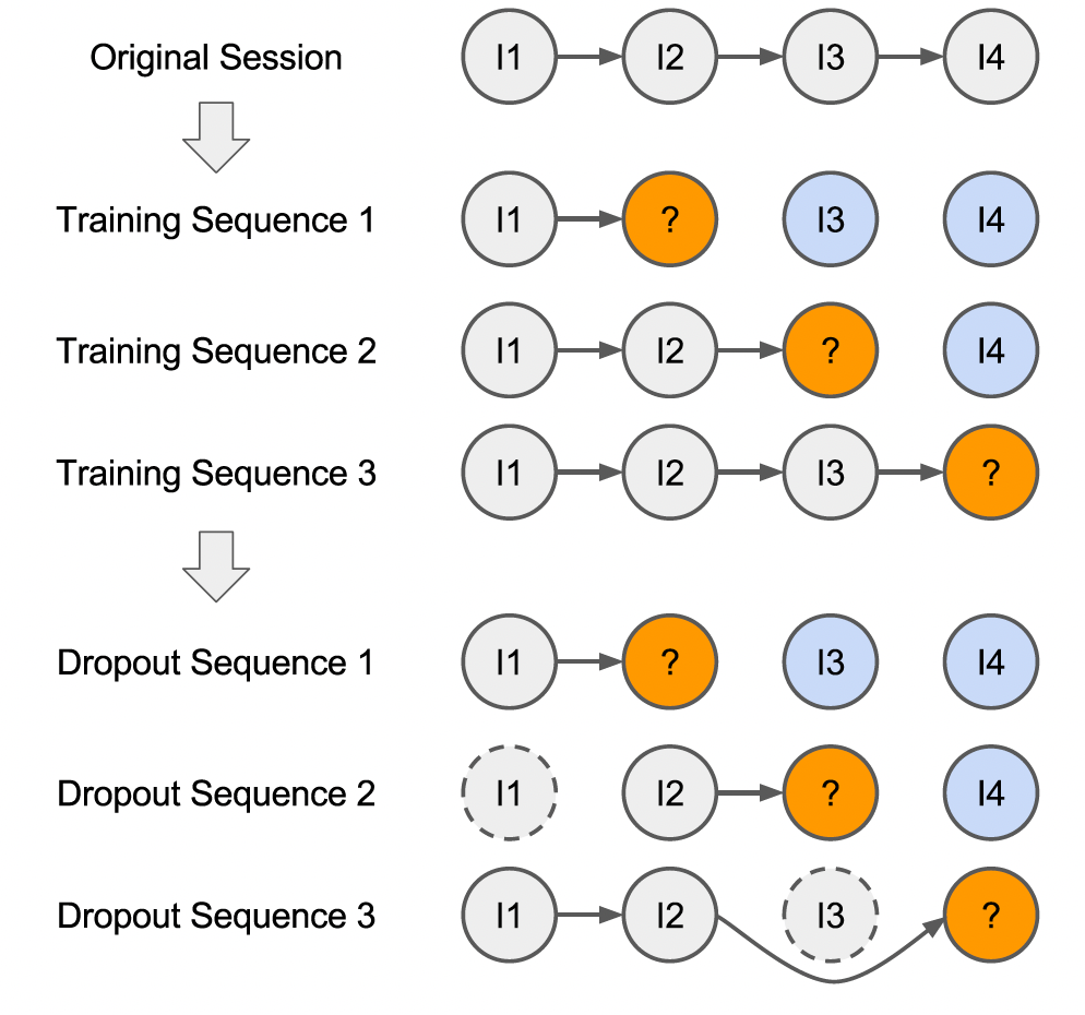 注意,相同序列在不同的训练epoch 会丢弃不同的点击item 。