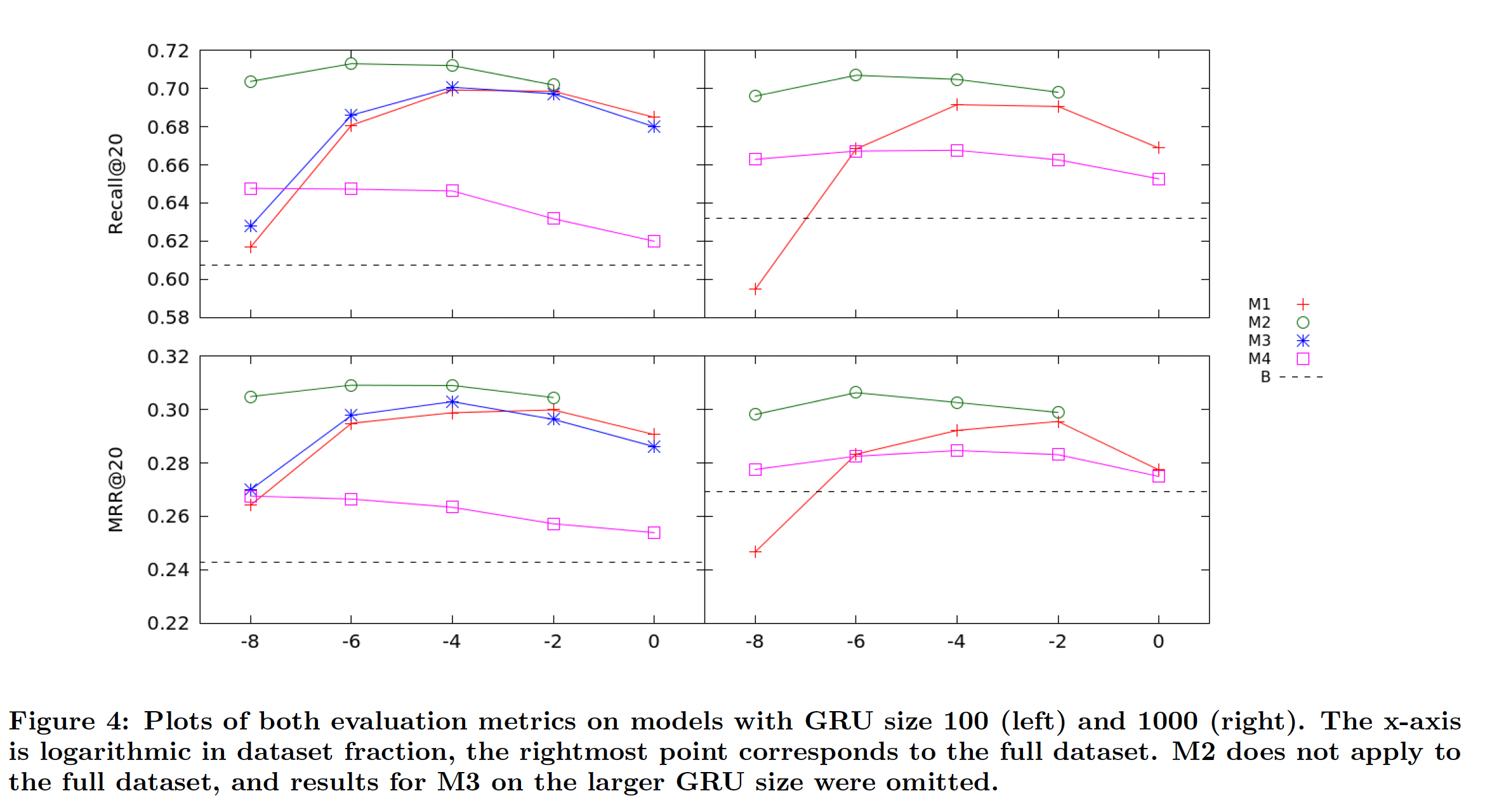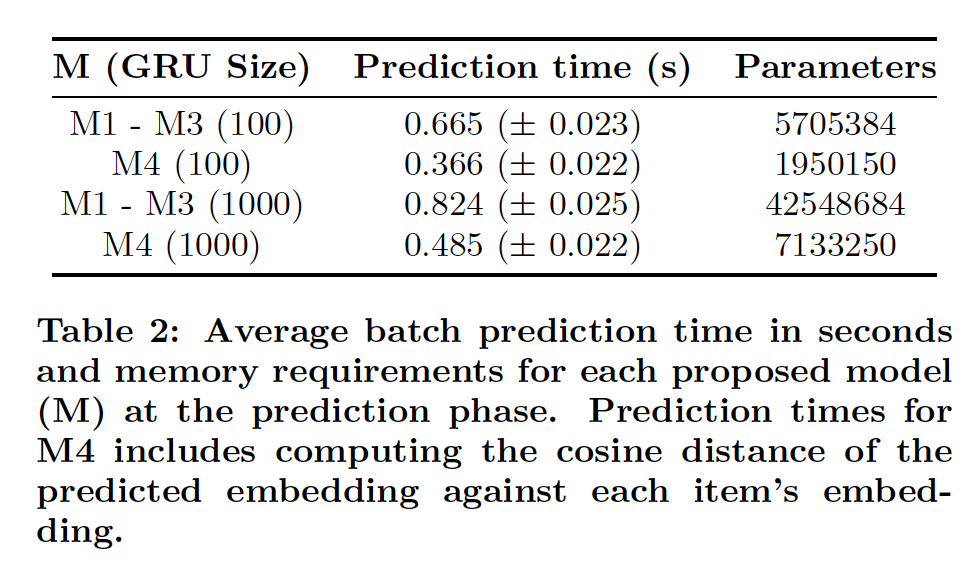 M4:模型的输出直接预测 item embedding。我们在 recurrent layer 和输出层之间添加了一个全连接的隐层,因为我们发现这提高了模型的稳定性。我们为这些模型使用了embedding,这些 embedding 是由 M1 在整个训练数据集上训练得到的。