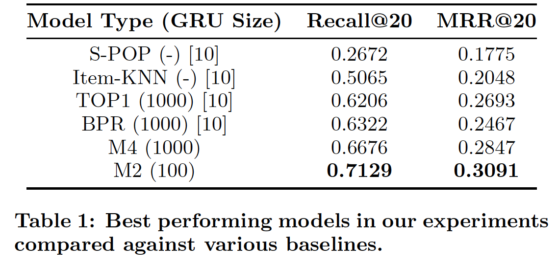 下表还报告了我们表现最好的模型,我们还列出了 《Session-based recommendations with recurrent neural networks》 中报告的 baseline 结果,包括他们最好的、基于 RNN 的模型(即 TOP1 和 BPR)以及两种传统算法(即 S-POP 和 Item-KNN)。令人惊讶的是,从 GRU 100 到 GRU 1000,我们模型的性能(M1 ~ M3 )并未显著提升。