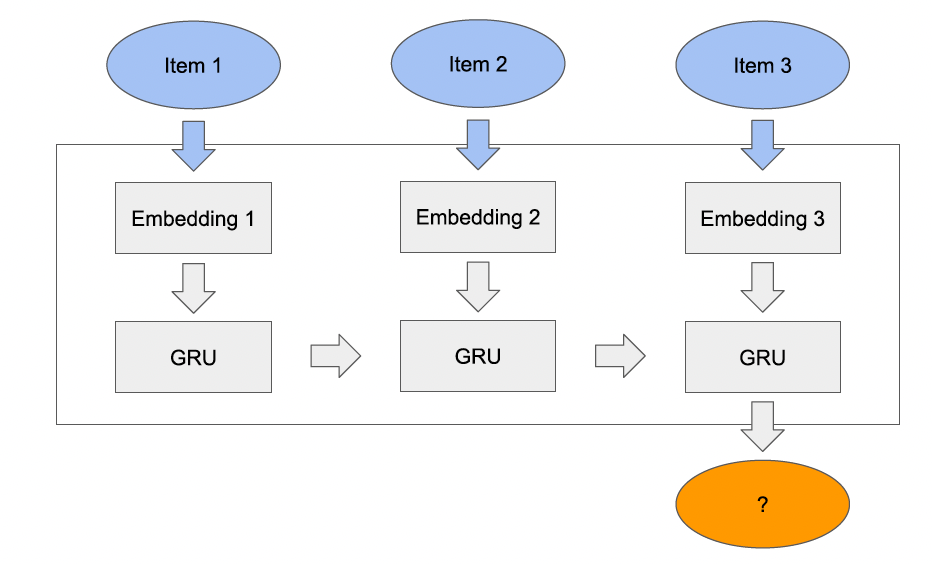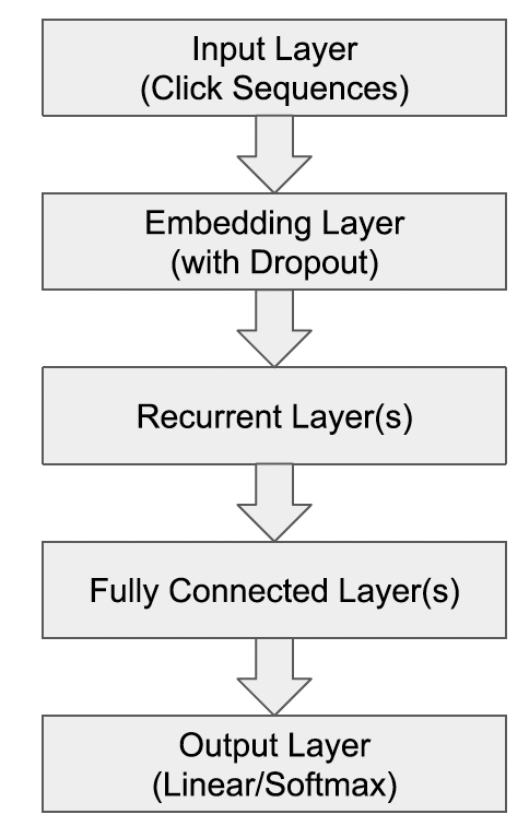 我们遵循下图所示 RNN 模型的通用结构。对于recurrent layer ,我们使用 Gated Recurrent Unit: GRU ,因为 《Session-based recommendations with recurrent neural networks》 中发现它优于 LSTM 单元。但是,我们没有使用 stateful RNN 训练过程,在 stateful RNN 训练过程中模型以 session-parallel 、sequence-to-sequence 的方式进行训练。相反,我们的网络处理每个序列 next click