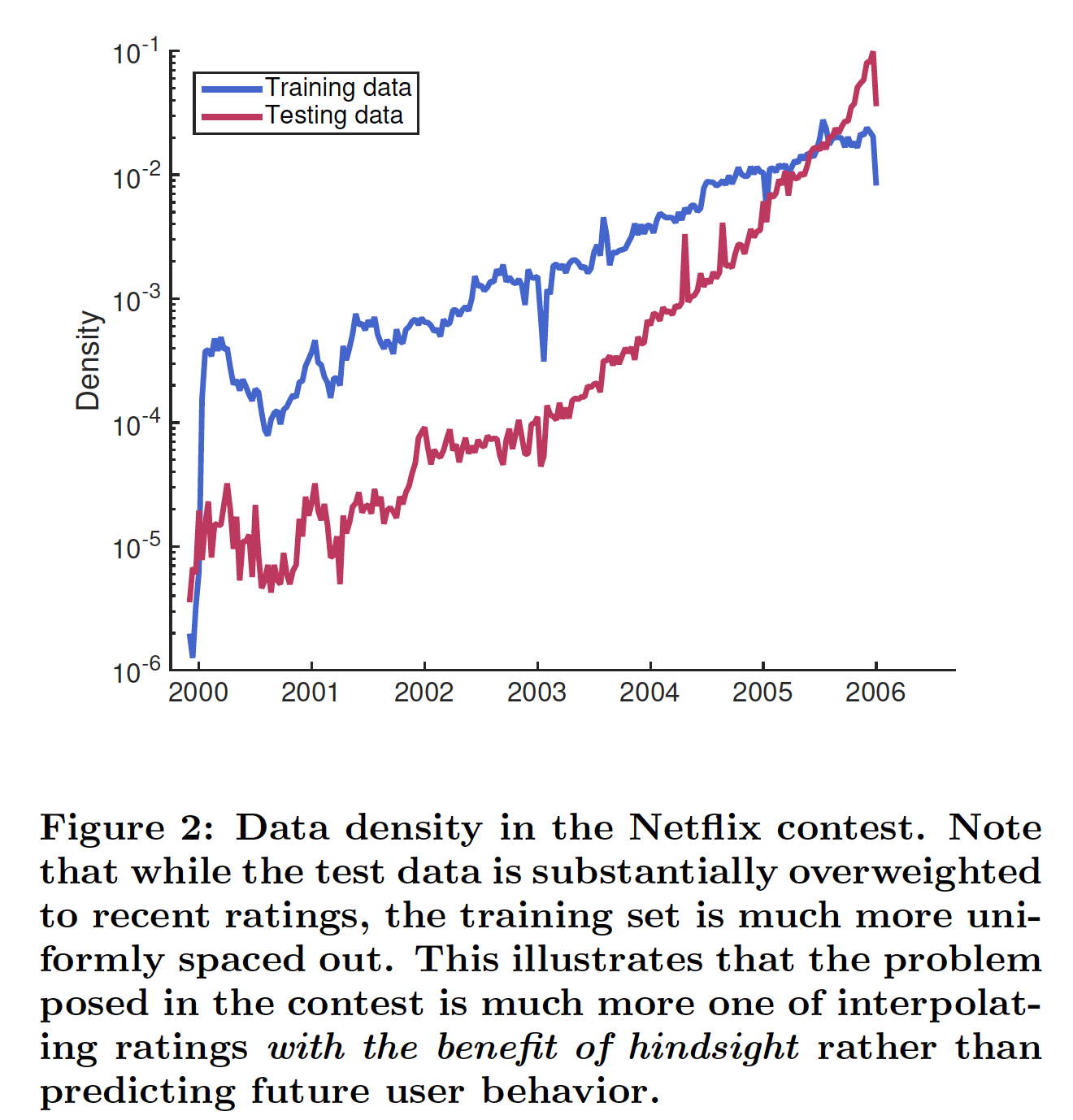 Netflix竞赛中的数据密度。注意,测试数据在近期的评分上的密度要大得多,而训练数据的评分密度要更为均匀。这说明竞赛中提出的问题更多的是利用事后诸葛亮的插值评分(interpolating rating)(泄露了未来的评分来评估当前评分),而不是预测未来的用户行为。这段话的意思是说:对于真实世界的推荐,测试集不应该是随机选择的,而只能是未来预测(