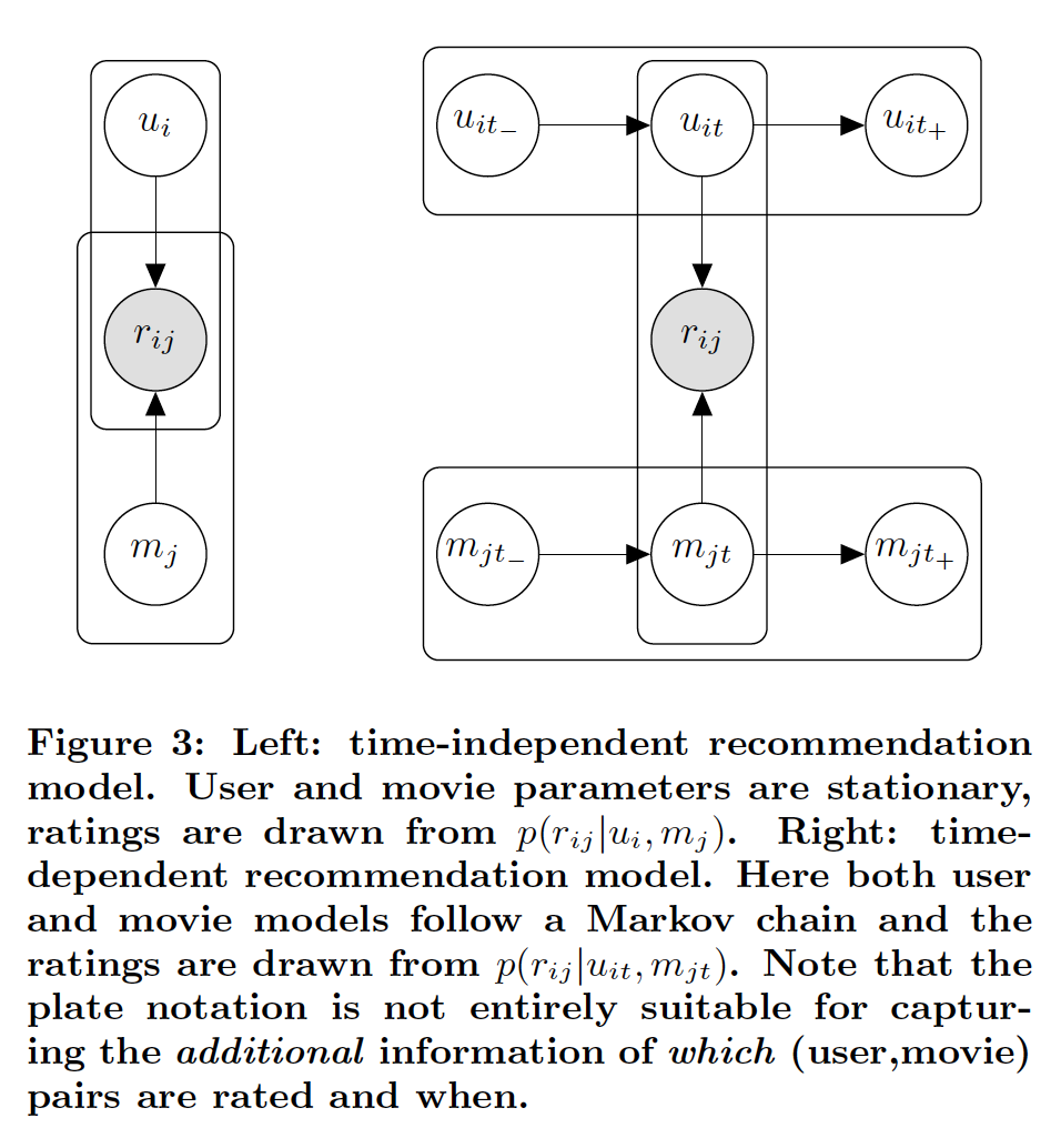 下图左侧为时间无关(time-independent)的推荐,用户parameter 和电影 parameter 都是静态(stationary)的。右侧为时间相关(time-dependent)的推荐,用户模型和电影模型都遵循马尔科夫链。