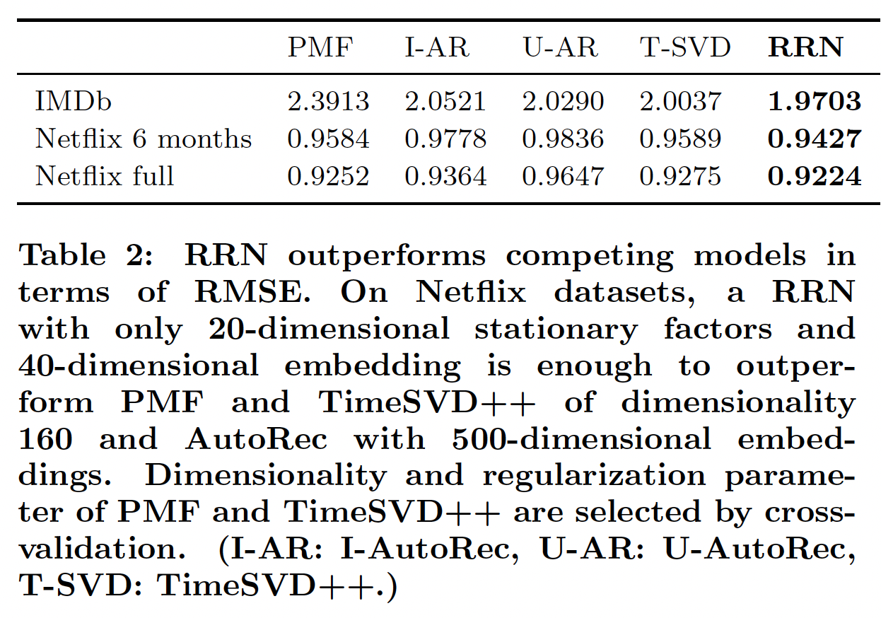 对于 IMDB,RRN 的大小与 PMF, TImeSVD++, U-AutoRec 相当,但是比 I-AutoRec 小得多。这是因为 RRN 使用与分解模型相同维度的 stationary state,并且包含一个相对较小的模型来捕获 temporal dynamic 。我们看到 RRN 在灵活性和准确性方面的明显优势,而不会牺牲模型大小。
