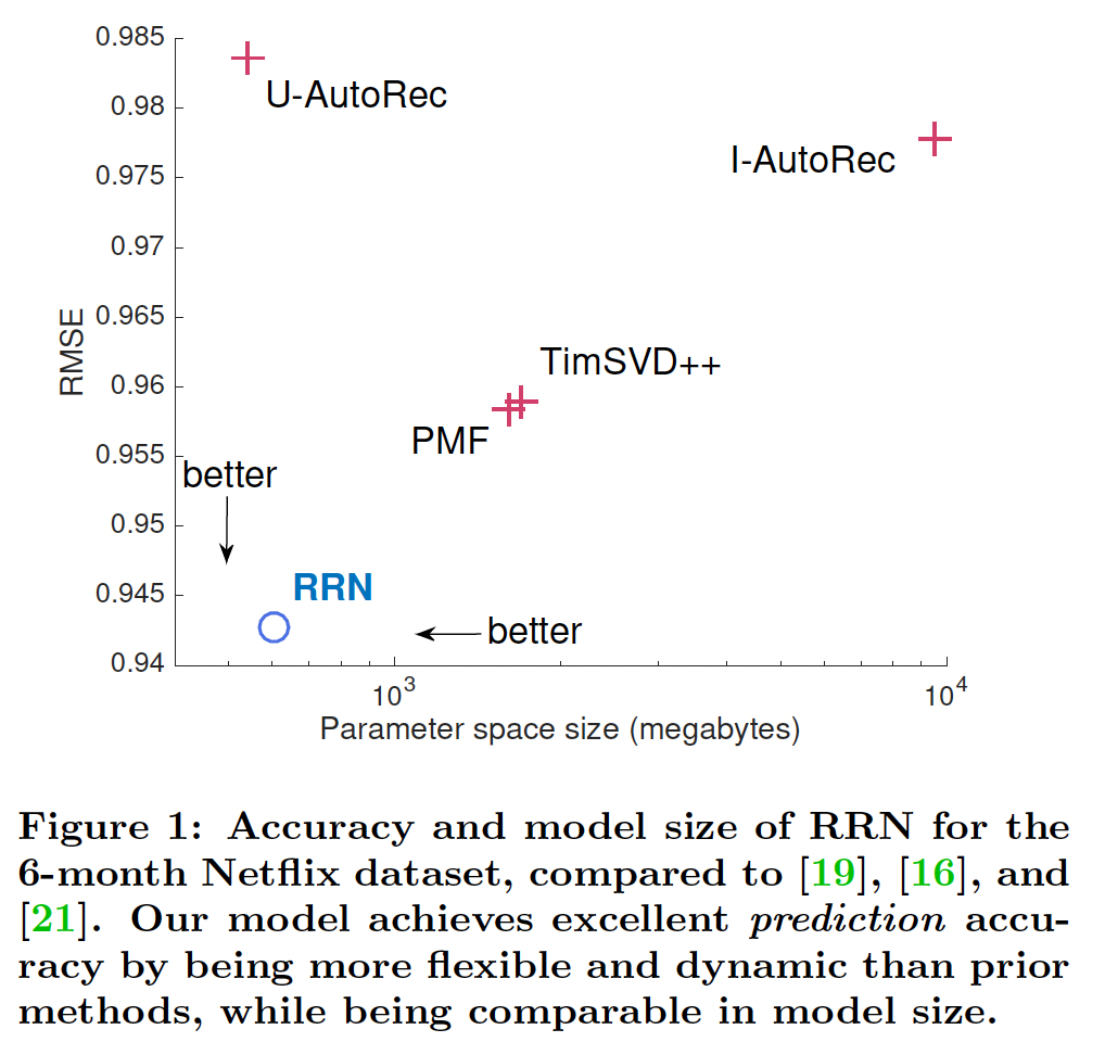 下图展示了6-month Netflix 数据集上的模型大小和 RMSE。