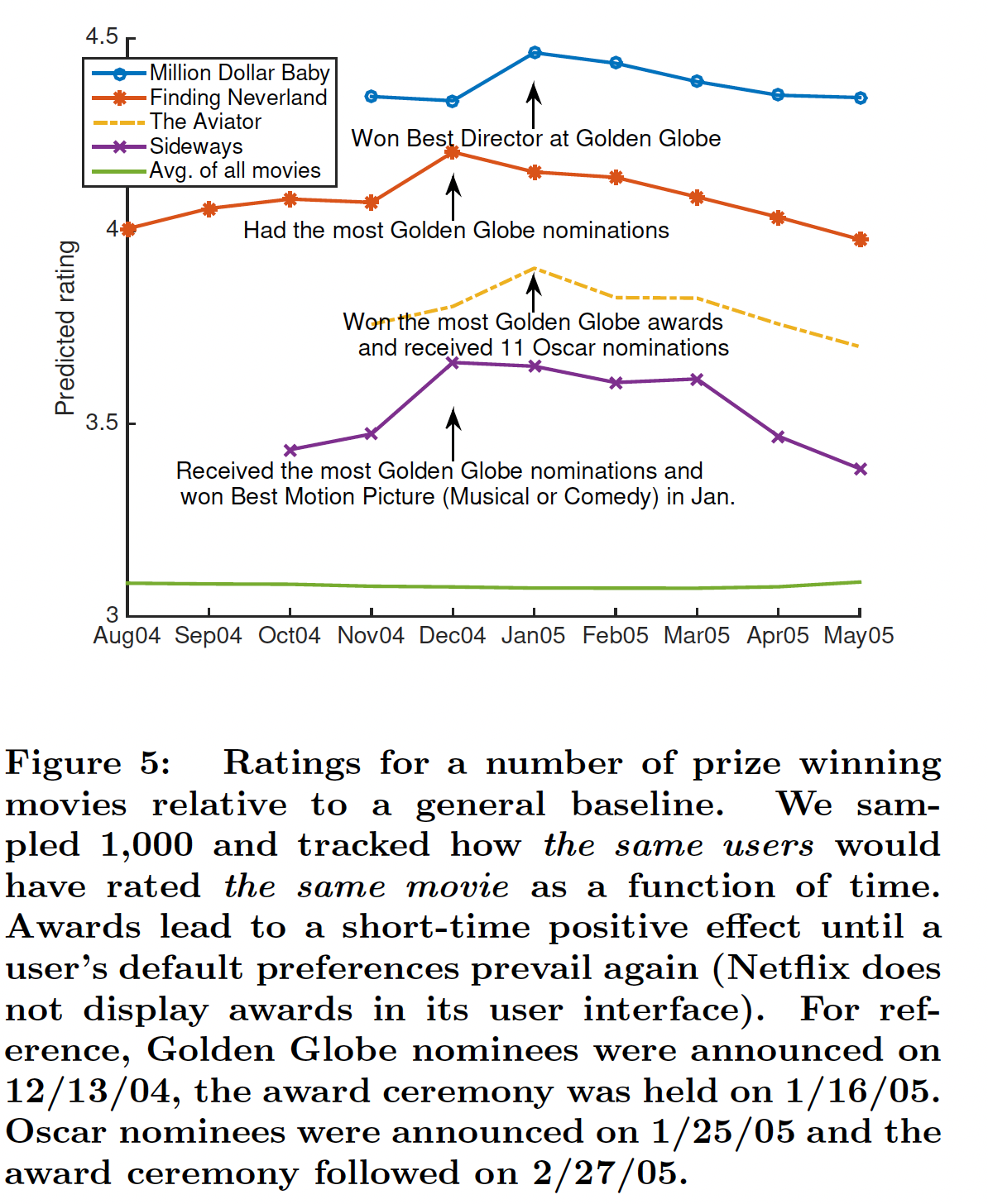 通过这种方式,我们自然会考虑到之前评分带来的因果关系。例如,我们能够解决享乐适应(hedonic adaptation),它指的是在电影推荐的背景下,用户观看了一部令人满意的电影之后,用户对电影的满意度的 level 会降低。对于令人失望的电影也是类似的。