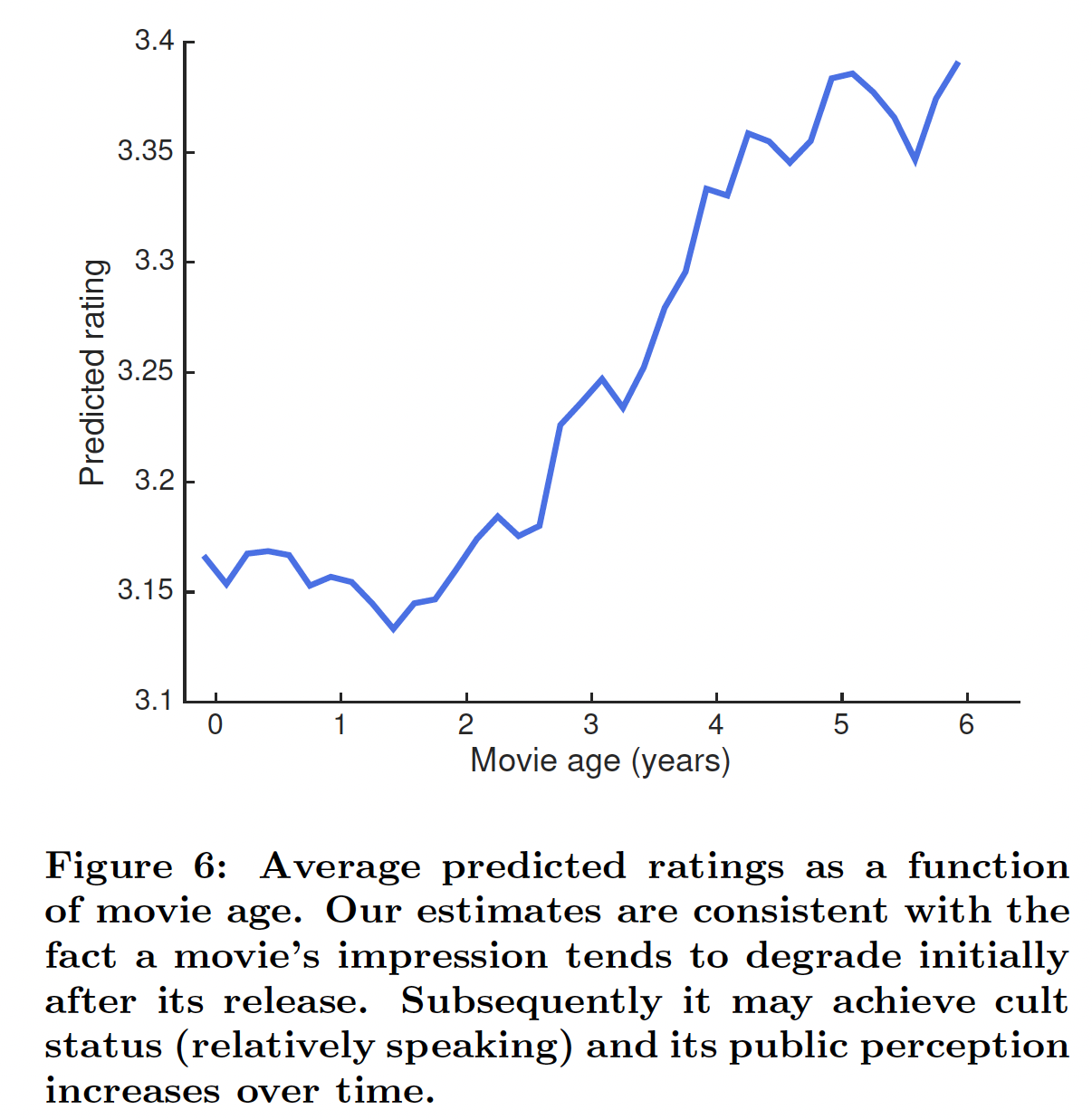首先,我们观察到年龄效应(age effect )。也就是说,一部电影的评分往往在上映后的第一年略有下降,然后随着年龄的增长而上升。在下图中,我们看到我们的模型显著地捕获到这种年龄效应并有效地适应。