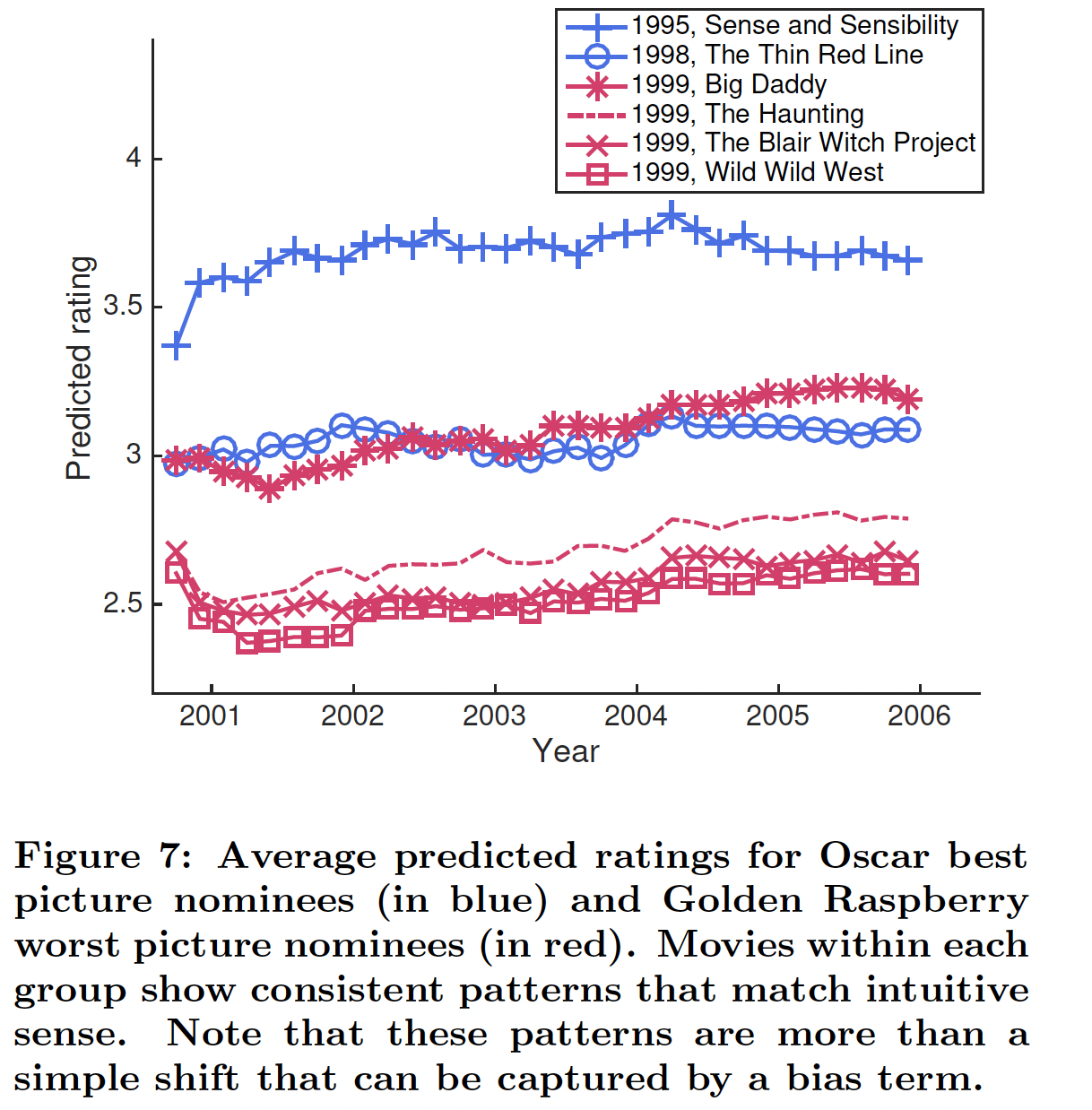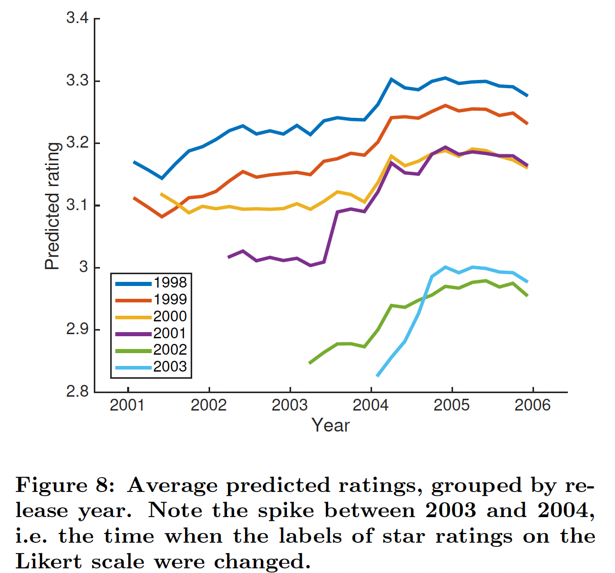 下图显示了按电影发行年份分组的平均预测评分。我们看到所有的曲线在 2004 年初都有一个与 scale change 相匹配的显著上升。这与 PMF 形成对比,PMF 的 embedding 是静态的,因此随着时间的推移平均预测是恒定的。