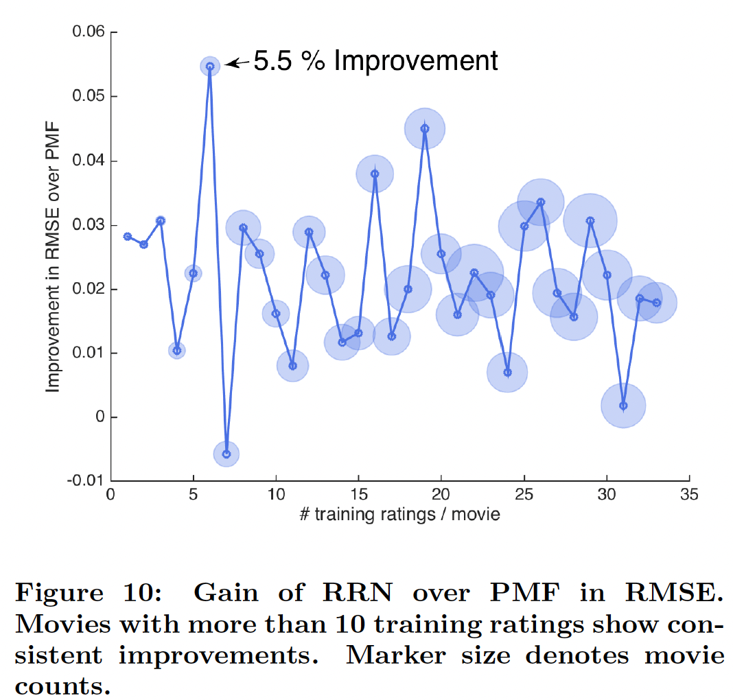 如下图所示,对于训练集中评分很少的用户,RRN 比 PMF 有所改进。对于训练集中评分非常少的用户,RRN (相比较 PMF)的相对改进最大。