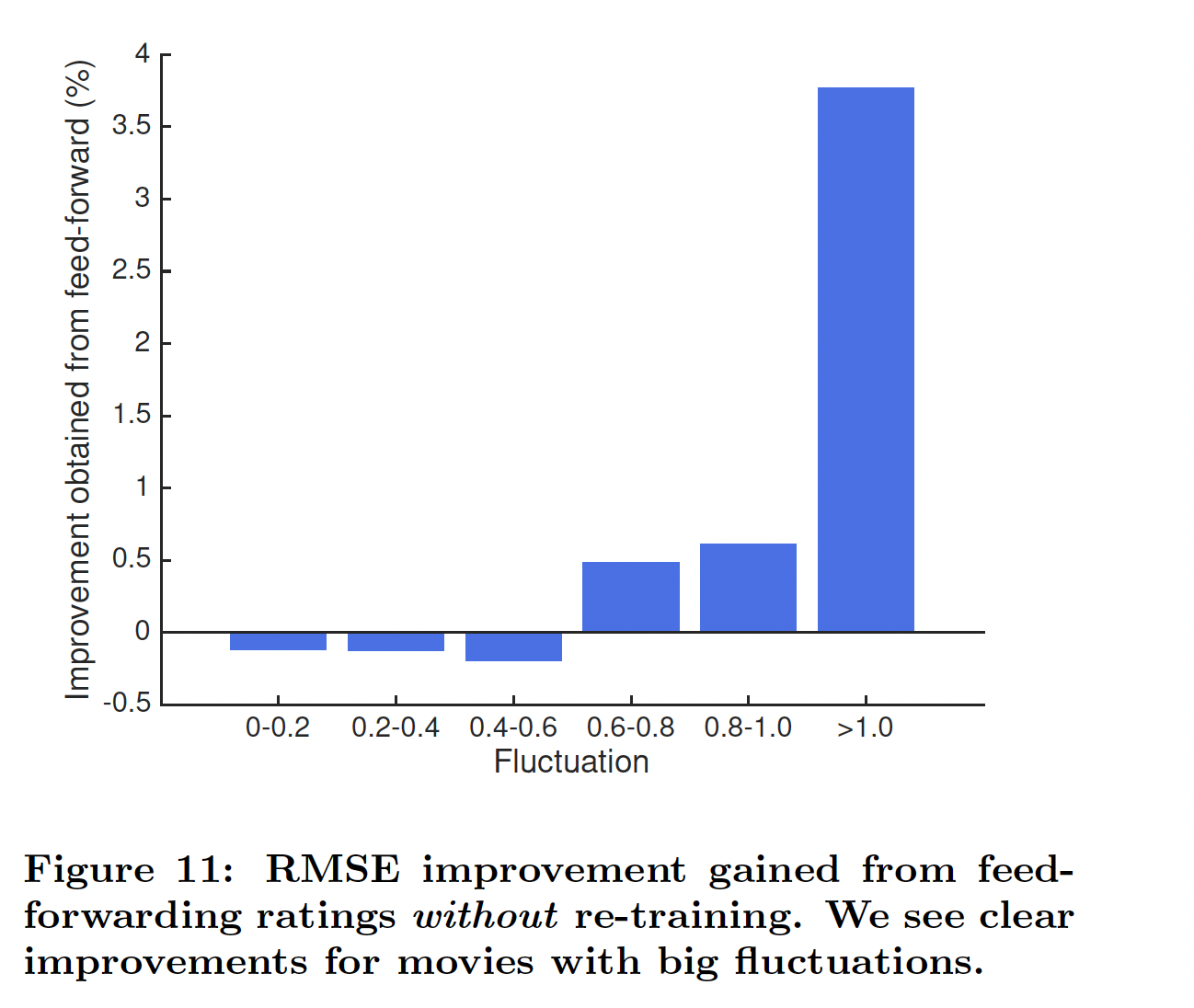 下图总结了该策略的 RMSE 改进。我们观察到:虽然我们的预训练模型没有捕获到小的波动,但是它成功地捕获了大的波动,从而显著提高了预测准确性。也就是说,使用 RRN 不仅缓解了频繁昂贵的重新训练的需要,而且还开辟了提供实时推荐的新途径。