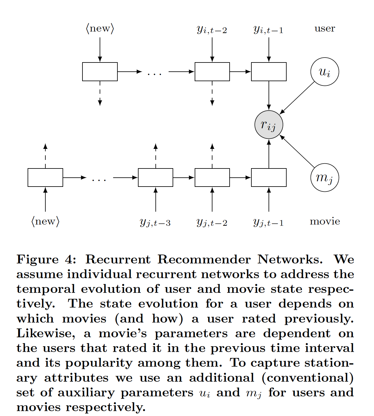 Recurrent Recommender Network: RRN 非常简洁,因为模型仅学习动态(dynamic)而不是状态(state)。这是与经典的潜在变量模型(latent variable model)的关键区别之一,其中潜在变量模型花了相当大的精力来用于估计潜在状态(latent state)。在这个方面上,RRN 非常类似于 《Autorec: Autoencoders meet collaborative filtering》 提出的神经自编码器(neural autoencoder)。事实上可以将神经自编码器视为RRN模型的一个特例。