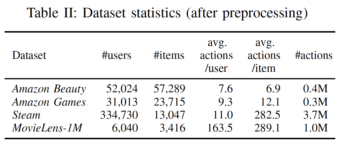数据集的统计特性参考下表。我们看到:两个 Amazon 数据集的 actions per user 和 actions per item 更少,Steam 的 actions per item 更高,而 MovieLens-1m 是最稠密的数据集。