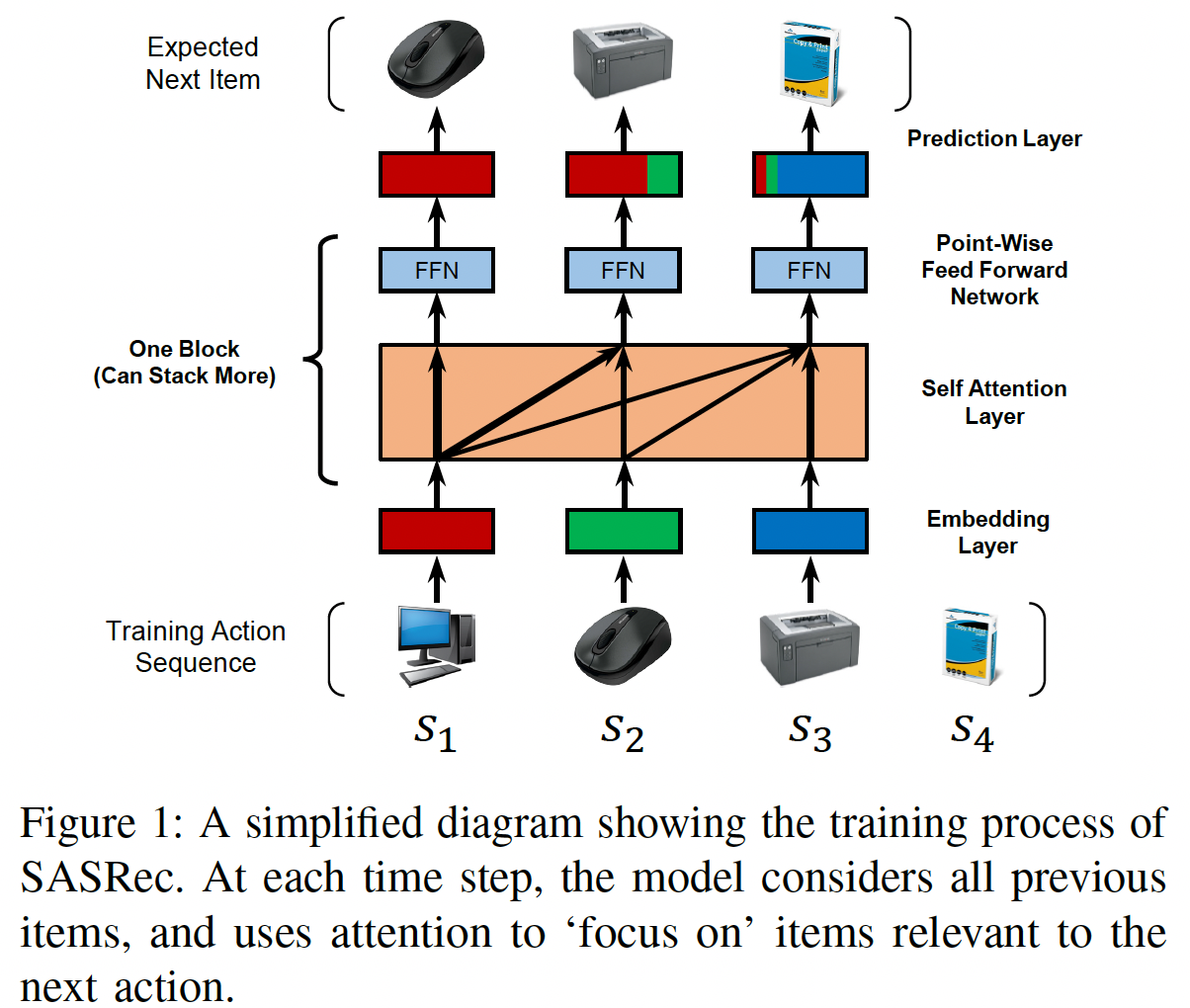在第一层 self-attention block 之后,item 的 embedding,即 self-attention block 来学习更复杂的 item transition 可能是有益的。具体而言,我们堆叠 self-attention block (即,一个 self-attention layer 和一个 FFN),并且第 block(