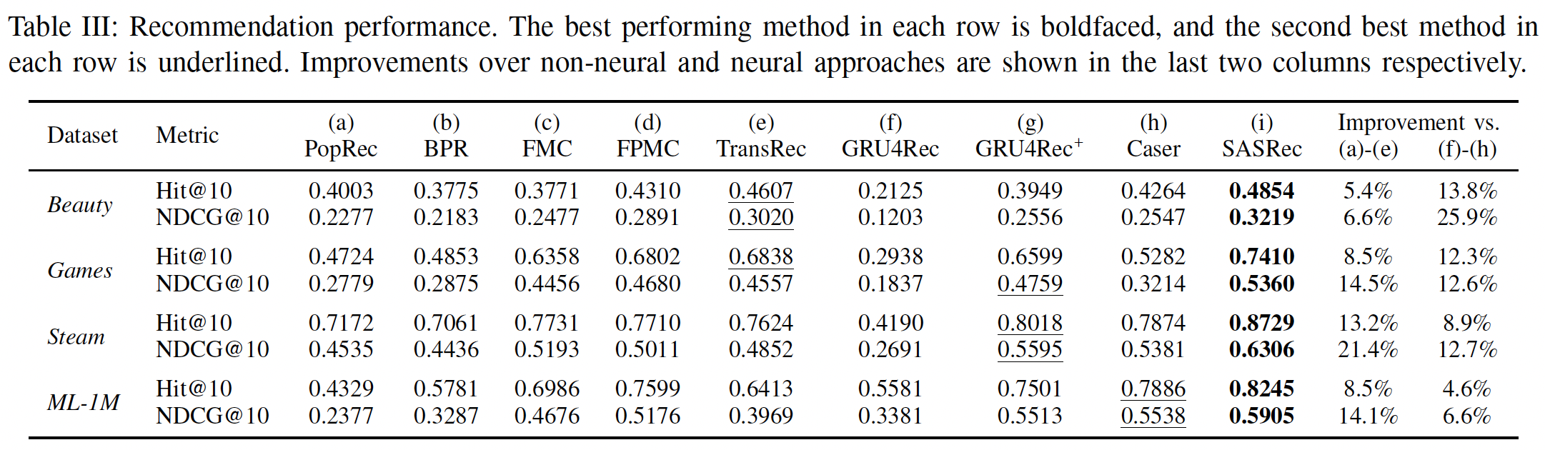 我们的方法 SASRec 在稀疏数据集和稠密数据集上都优于所有 baseline ,并且相对于最强的 baseline 在 Hit Rate 上平均提升 6.9%、在 NDCG 上平均提升 9.6% 。