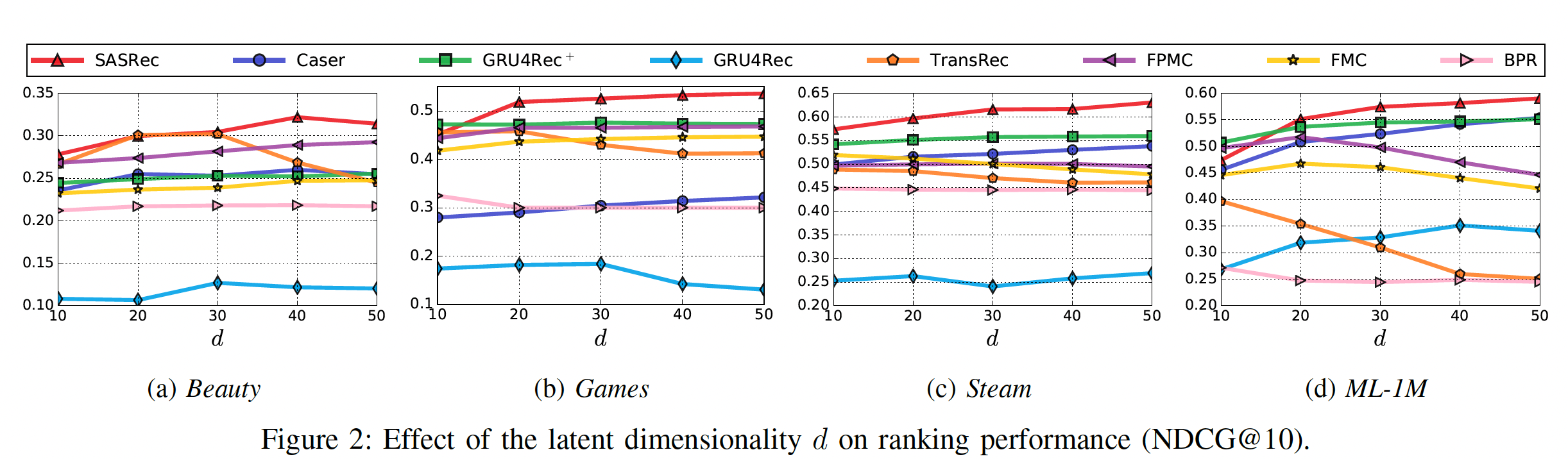 在下图中,我们还通过展示 10 到 50 的变化时所有方法的 NDCG@10 指标,从而分析关键超参数 SASRec 在