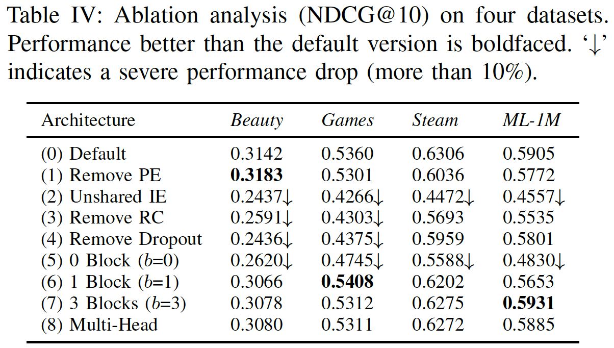 Remove RC(Residual Connections):我们发现,移除残差连接之后模型性能显著更差。这大概是因为 lower layer 中的信息(如,最近一个 item 的 embedding,第一个 block 的 output )无法轻易地传播到最后一层,而这些 lower layer 中的信息对于推荐非常有用,尤其是在稀疏数据集上。