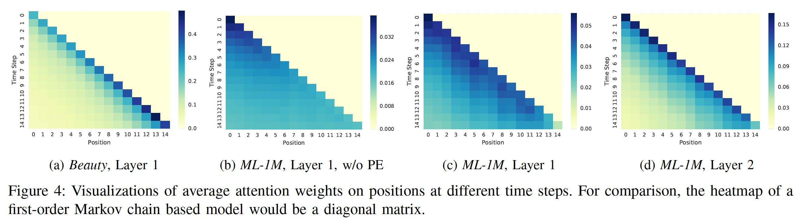 position 上的注意力:下图展示了最近 15 个 time step 在最近 15 个 position 上的平均注意力权重的四种热力图。注意,我们在计算平均权重时,分母是有效权重的个数,从而避免短序列中 padding item 的影响。
