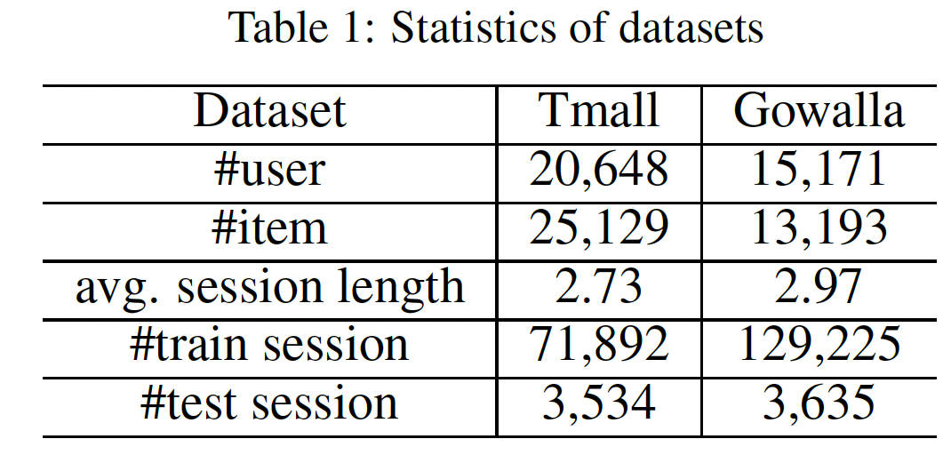 类似于 《Diversifying personalized recommendation with user-session context》 ,我们随机选择最近一个月 20% 的 session 进行测试,其余的用于训练。我们还在每个 session 中随机保留一个 item 作为待预测的 next item。