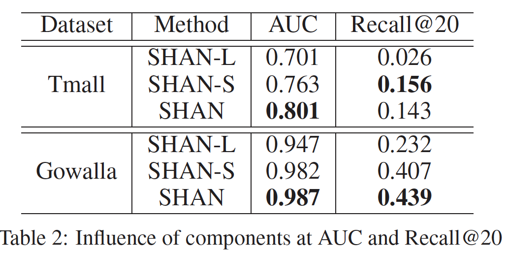 不同组件的影响:为了评估每个组件对 final user hybrid representation 的贡献,我们进行实验来分析下表中每个组件。SHAN-L 表示仅建模用户的通用品味,SHAN-S 表示仅建模用户的短期偏好。