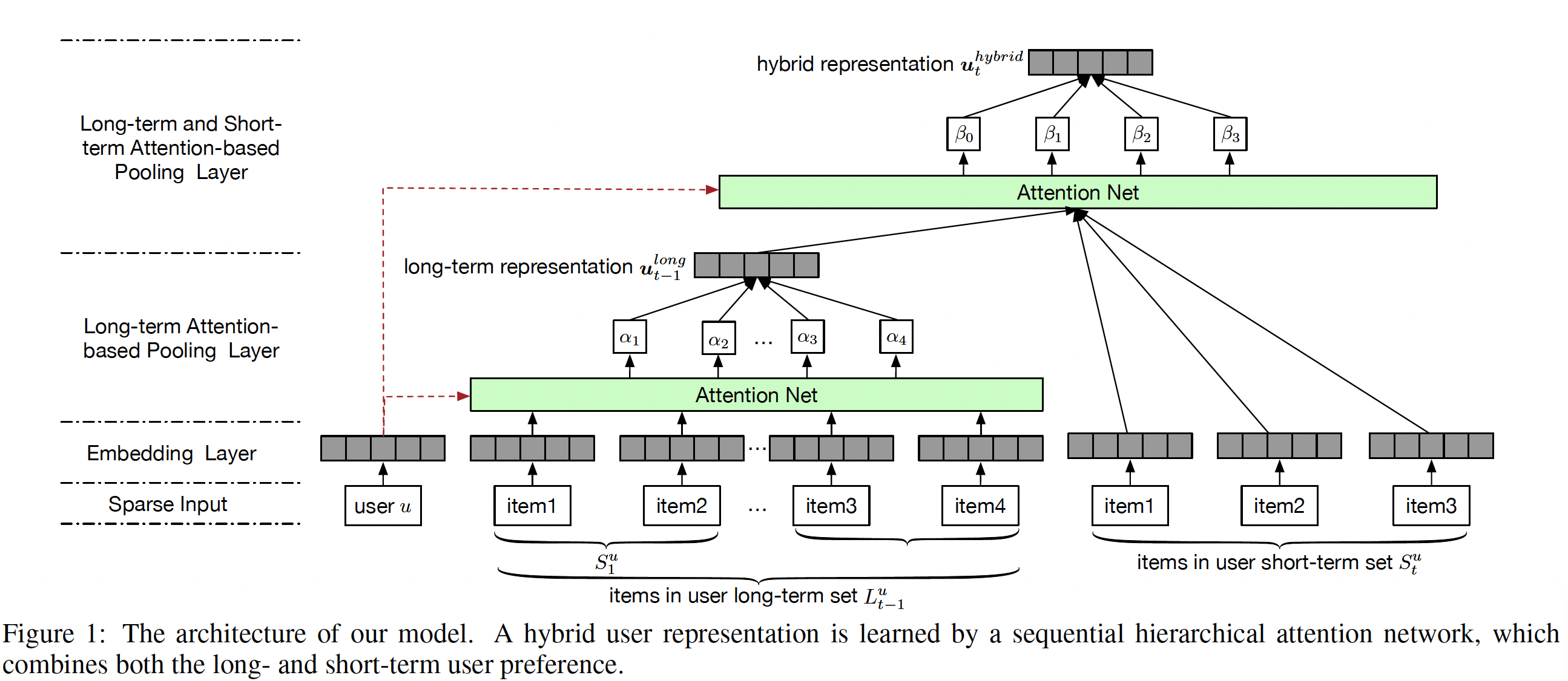 通过层级结构,论文结合用户的长期偏好和短期偏好来生成用户的 high-level hybrid representation 。