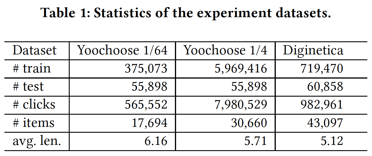 经过预处理之后,Yoochoose 数据集包含 37483 个 item、7966257 个 session、31637239 个点击事件;Diginetica 数据集包含 43097 个 item、202633 个 session、982961 个点击事件。