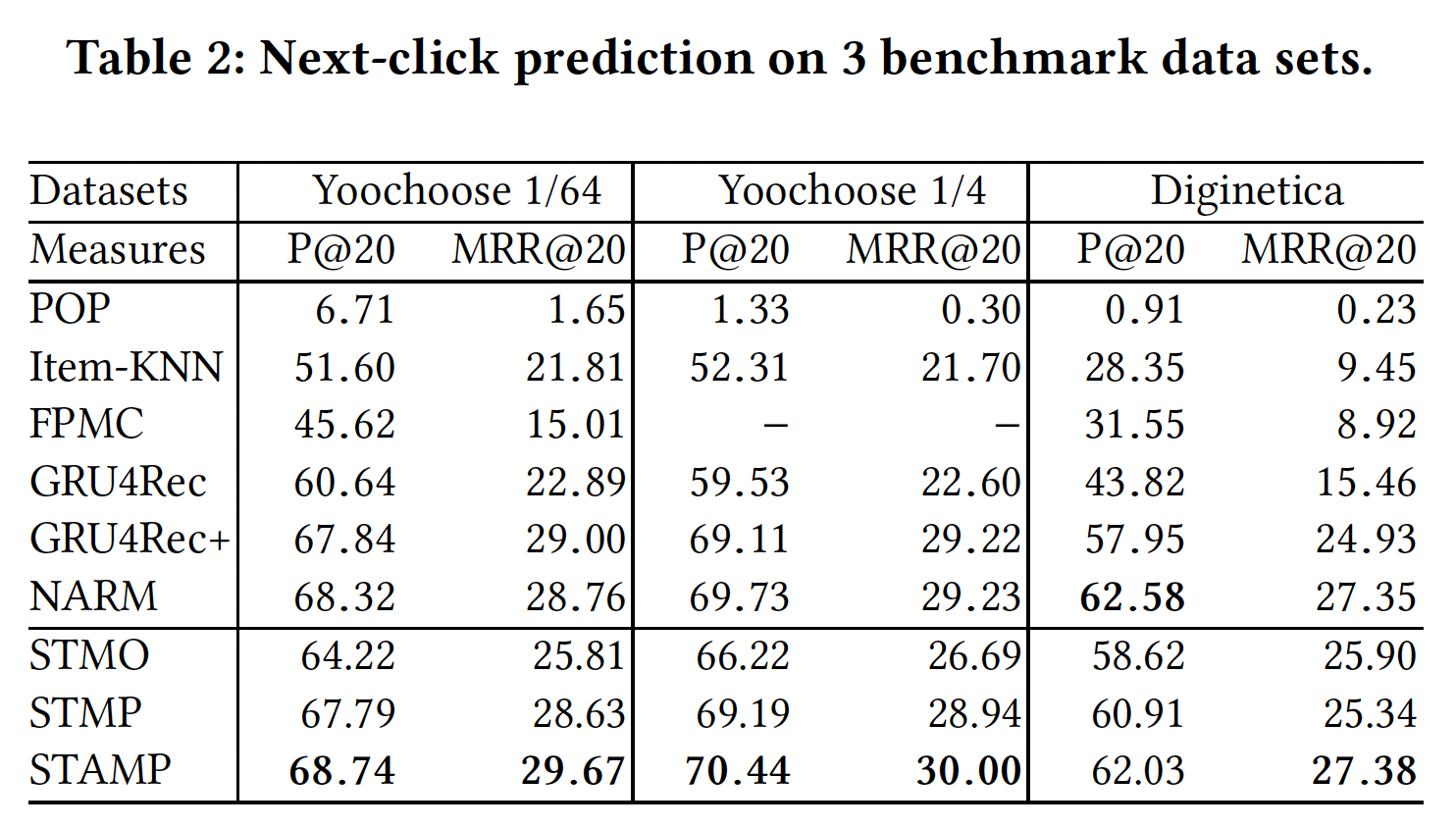 在我们提出的模型中,STAMP 模型在两个实验中,在 Yoochoose 数据集上获得了最高的 P@20 和 MRR@20 ,并在 Diginetica 数据集上取得了可比的结果。