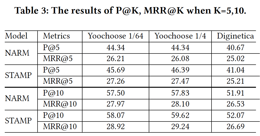 为了验证我们提出的 STAMP 模型和 SOTA 的 NARM 模型在实际生产环境中的表现(即,推荐系统一次仅推荐几个 item),ground truth 应该位于 ranking list 的前面。因此,我们使用 P@5, MRR@5, P@10, MRR@10 来评估推荐质量从而试图模拟实际情况。结果如下表所示,并且我们认为实验结果可能在一定程度上反映了它们在实际生产环境中的表现。