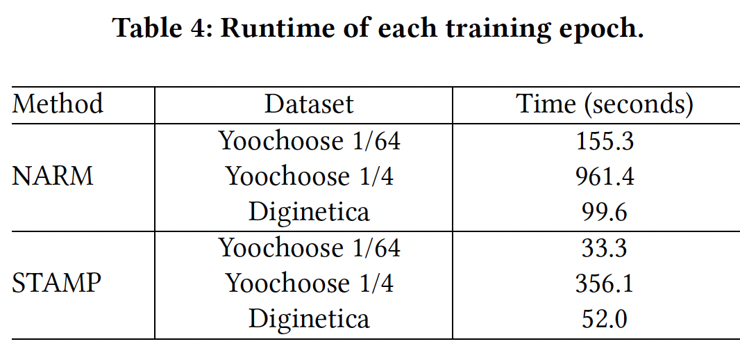 我们还记录了 NARM 和 STAMP 方法的运行时间。我们使用相同的 100 维 embedding 向量来实现这两个模型,并在同一个 GPU server 上测试它们。下表给出了三个数据集上每个 epoch 的训练时间。结果表明 STAMP 比 NARM 更有效率。